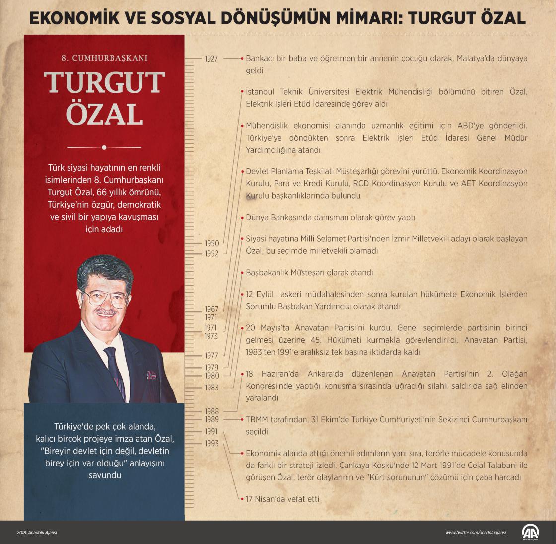 Türk siyasi hayatının en renkli isimlerinden 8. Cumhurbaşkanı Özal, 66 yıllık ömrünü, Türkiye'nin özgür, demokratik ve sivil bir yapıya kavuşması için adadı. Türkiye'de pek çok alanda kalıcı birçok projeye imza atan Özal, "Bireyin devlet için değil, devletin birey için var olduğu" anlayışını savundu. Özal, döneminin sorunlarına farklı bakış açılarıyla yaklaştı, Türkiye'nin ekonomik ve sosyal gelişimine önemli katkılar sağladı.