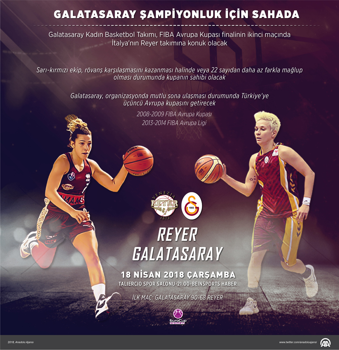 Galatasaray Kadın Basketbol Takımı, FIBA Avrupa Kupası finalinin ikinci maçında yarın İtalya'nın Reyer takımıyla deplasmanda karşı karşıya gelecek. Venedik'teki Taliercio Spor Salonu'nda yapılacak maç TSİ 21.00'de başlayacak. Karşılaşma beINSports Haber'den naklen yayımlanacak. Galatasaray, İstanbul'da oynanan ilk karşılaşmada rakibini 90-68 mağlup etmişti. Sarı-kırmızı ekip, rövanş karşılaşmasını kazanması halinde veya 22 sayıdan daha az farkla mağlup olması durumunda kupanın sahibi olacak. Sarı-kırmızılı takım, bu sezon FIBA Kadınlar Avrupa Ligi'nde başlayan mücadelesini Avrupa Kupası'nda sürdürdü. ( Kemal Delikmen - Anadolu Ajansı )17 Nisan 2018•Güncelleme: 17 Nisan 2018