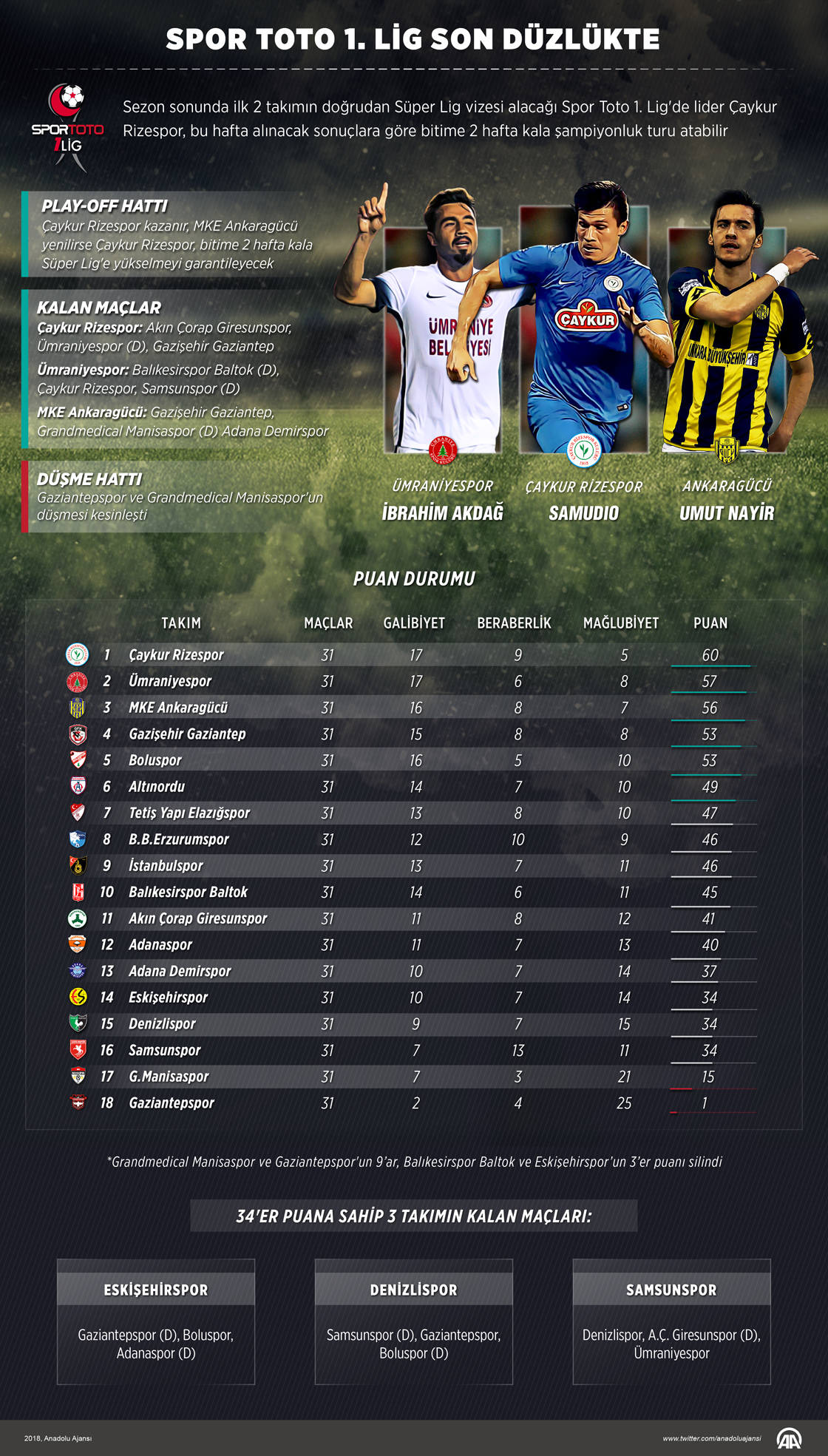 İlk iki takımın Süper Lig'e yükseleceği Spor Toto 1. Lig'de Çaykur Rizespor, son 3 haftaya 3. sıradaki MKE Ankaragücü'nün 4 puan önünde girdi. Çaykur Rizespor'un bu hafta alınacak sonuçlara göre Süper Lig'e yükselmeyi garantileme ihtimali bulunuyor. Lige veda eden iki ekibin belli olduğu son 3 haftaya 34'er puanla giren 3 takımdan Samsunspor ile Denizlispor bu hafta kritik bir karşılaşmaya çıkacak.
