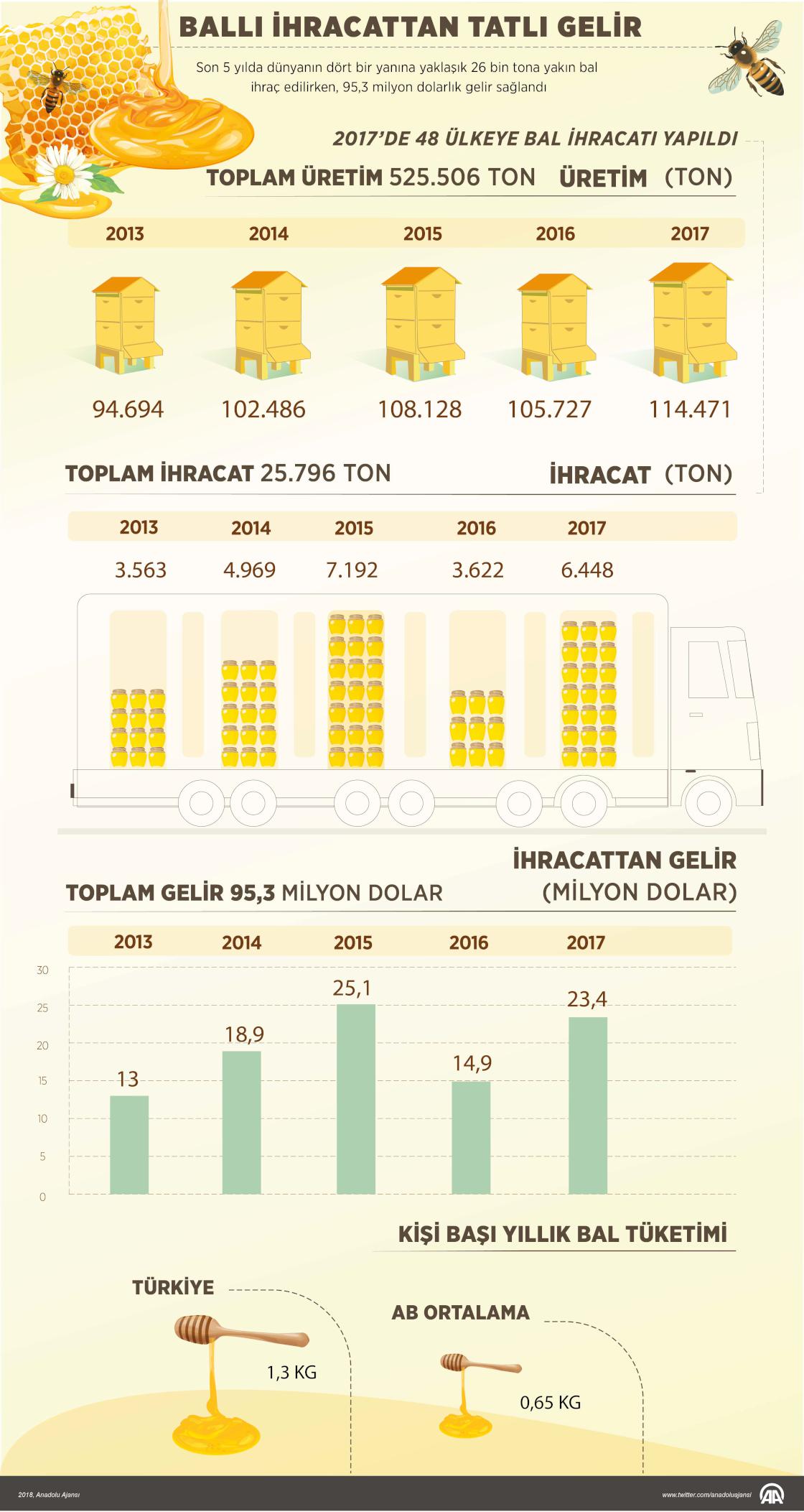 Türk balı geçen yıl ABD ve Almanya başta olmak üzere 48 ülkede ağızları tatlandırdı. Son 5 yılda ise dünyanın dört bir yanına yaklaşık 26 bin ton bal ihraç edilerek, karşılığında 95,3 milyon dolar gelir sağlandı. ( Gözde Gültekinler - Anadolu Ajansı )