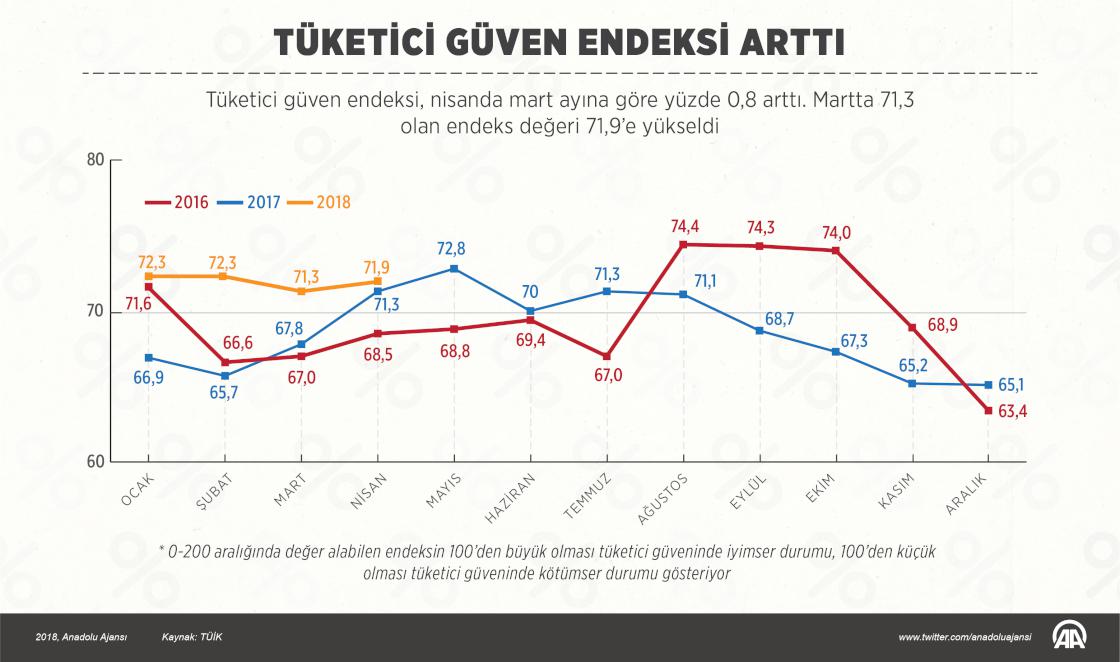 Tüketici güven endeksi, nisan ayında mart ayına kıyasla yüzde 0,8 arttı. Martta 71,3 olan endeks değeri 71,9'a yükseldi. ( Yasin Demirci - Anadolu Ajansı )