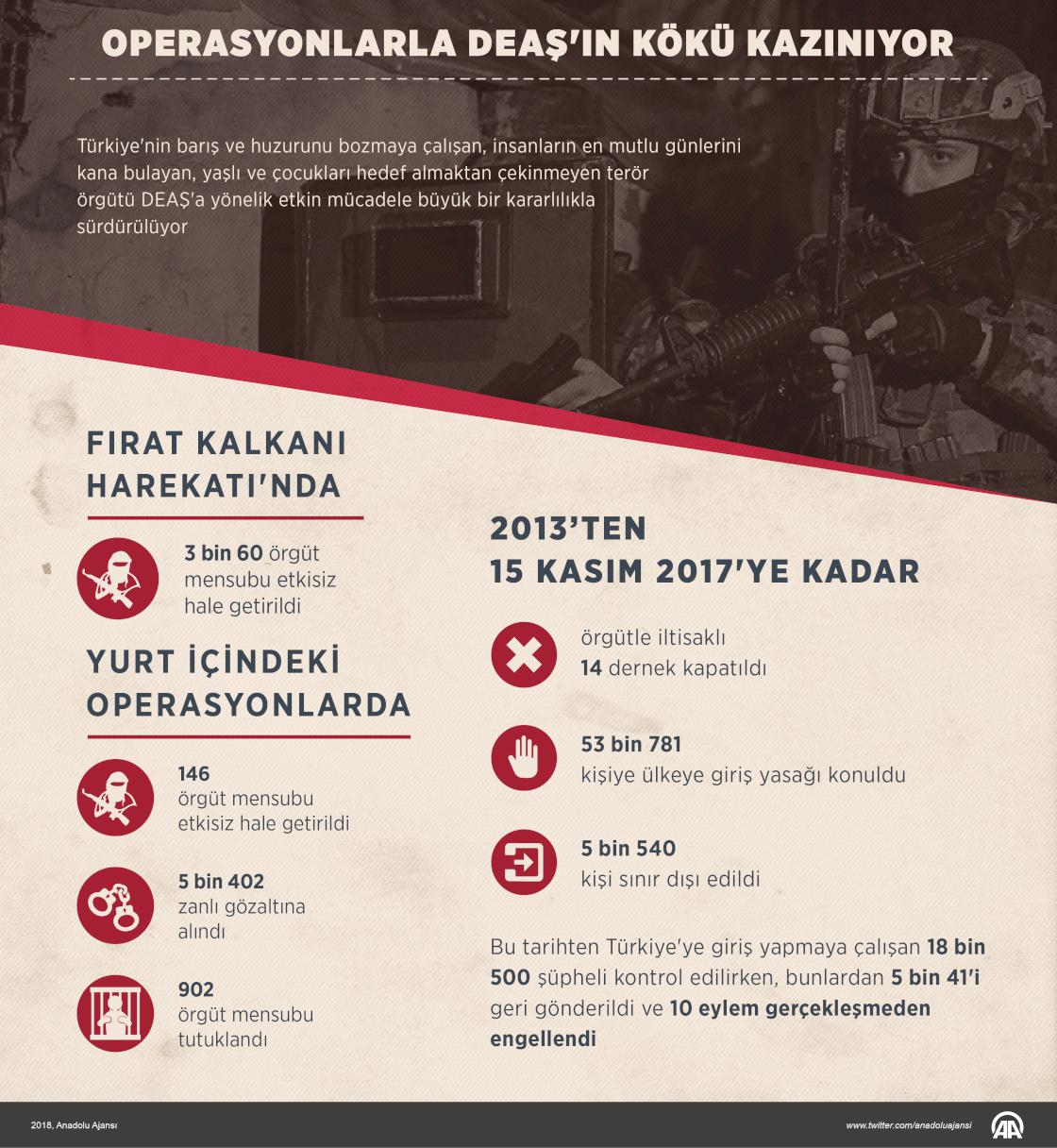 Türkiye'nin barış ve huzurunu bozmaya çalışan, insanların en mutlu günlerini kana bulayan, yaşlı ve çocukları hedef almaktan çekinmeyen terör örgütü DEAŞ'a yönelik etkin mücadele kararlılıkla devam ediyor. Türkiye'ye yönelik faaliyetlerine 2013'ten itibaren başlayan DEAŞ, aynı yıl terör örgütleri listesine alındı. 2014'te DEAŞ'ın Musul'u ele geçirmesinden sonra Türkiye'nin Musul Başkonsolosluğunda görevli 49 kişiyi rehin almasıyla artan tehdit, ilerleyen süreçte yurt dışından ülke içine taşındı.
