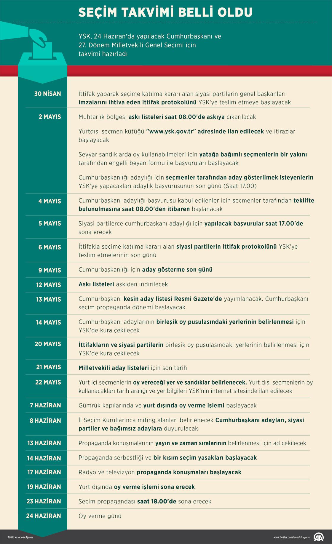 YSK, 24 Haziran'da yapılacak Cumhurbaşkanı ve 27. Dönem Milletvekili Genel Seçimi için takvimi hazırladı. Buna göre, seçimin başlangıcı 30 Nisan olacak, cumhurbaşkanlığı adaylığı için başvurular 1 Mayıs'ta başlayacak, seçmenler tarafından aday gösterilenler için gerekli 100 bin imzanın 4-9 Mayıs tarihlerinde toplanması gerekecek, seçmenler bu süre içinde ilçe seçim kurullarına imza verecek. İttifak yaparak seçime katılma kararı alan siyasi partilerin genel başkanlarının imzalarını içeren ittifak protokolünün YSK'ye teslim edilmesinin son günü 6 Mayıs olacak. ( Yasin Demirci - Anadolu Ajansı )26 Nisan 2018•Güncelleme: 26 Nisan 2018