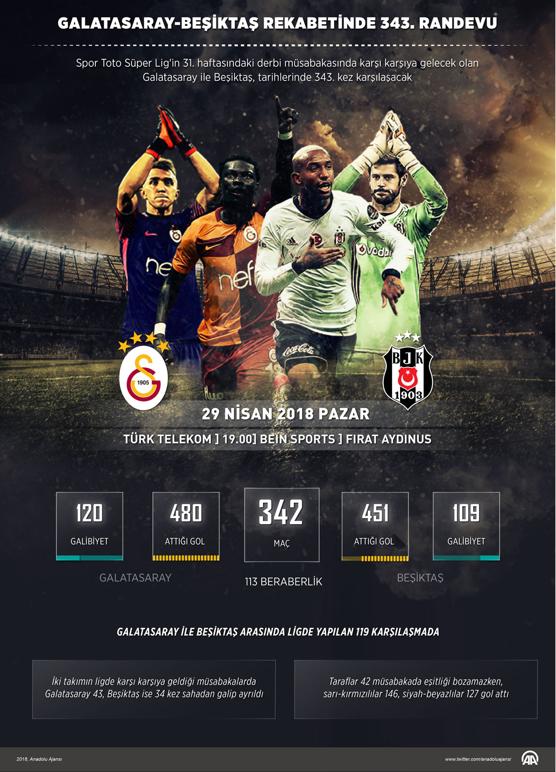 Spor Toto Süper Lig'in 31. haftasındaki derbi müsabakasında karşı karşıya gelecek olan Galatasaray ile Beşiktaş, tarihlerinde 343. kez karşılaşacak. ( Kemal Delikmen - Anadolu Ajansı )