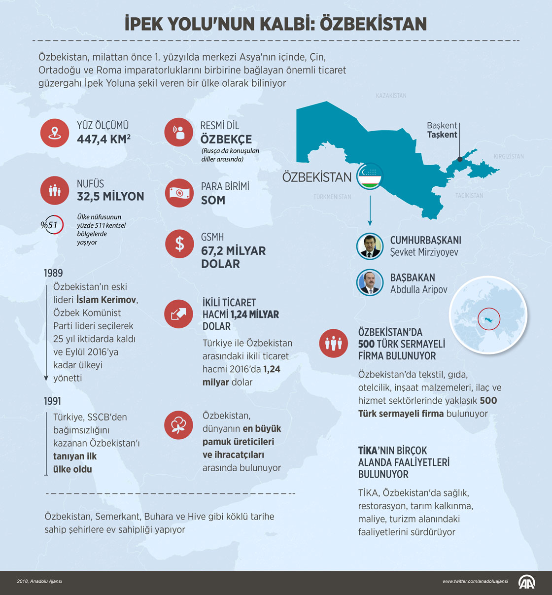 Özbekistan, milattan önce 1. yüzyılda merkezi Asya'nın içinde, Çin, Ortadoğu ve Roma imparatorluklarını birbirine bağlayan önemli ticaret güzergahı İpek Yoluna şekil veren bir ülke olarak biliniyor.