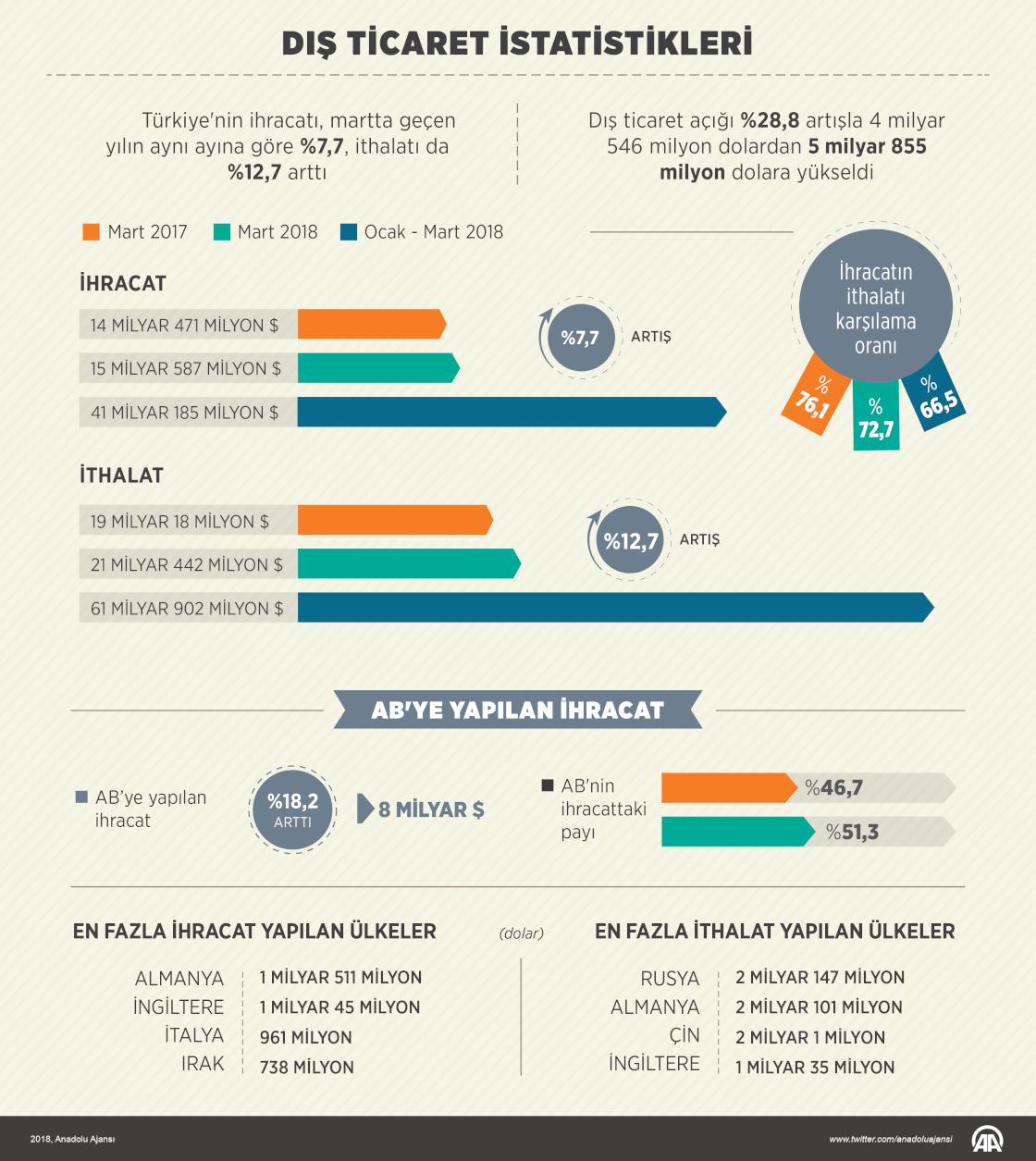Türkiye İstatistik Kurumu (TÜİK) ile Gümrük ve Ticaret Bakanlığı tarafından oluşturulan mart ayına ilişkin geçici dış ticaret istatistikleri açıklandı. Türkiye'nin ihracatı, martta geçen yılın aynı ayına göre yüzde 7,7 artarak 15 milyar 587 milyon dolar, ithalatı yüzde 12,7 artışla 21 milyar 442 milyon dolar oldu.