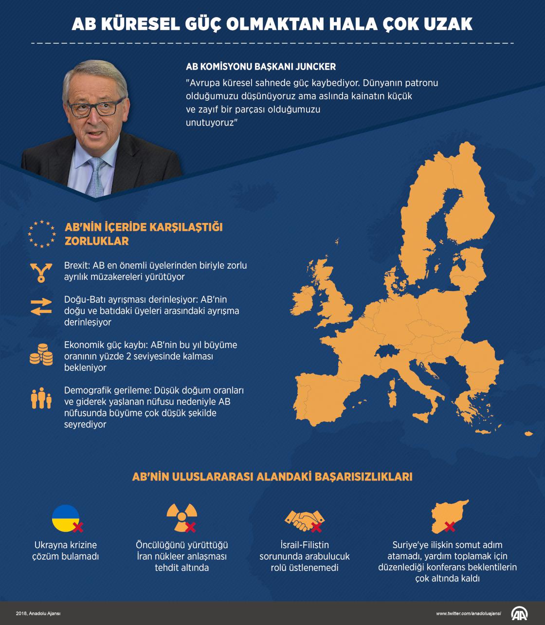 AB Komisyonu Başkanı Juncker'in Avrupa'nın küresel sahnede güç kaybettiğine ilişkin açıklamalarının ardından dikkatler, Birliğin yakın dönemdeki başarısızlıklarına odaklandı. AB, Birlik içinde Brexit, üye ülkeler arasında derinleşen ayrım, ekonomik ve demografik güç kaybıyla boğuşuyor. Uluslararası alanda ise AB'nin öncülüğünü yaptığı İran nükleer anlaşması tehdit altına girerken, Birliğin İsrail-Filistin sorunu ve Suriye gibi uluslararası konularda inisiyatif alamadığı görülüyor.