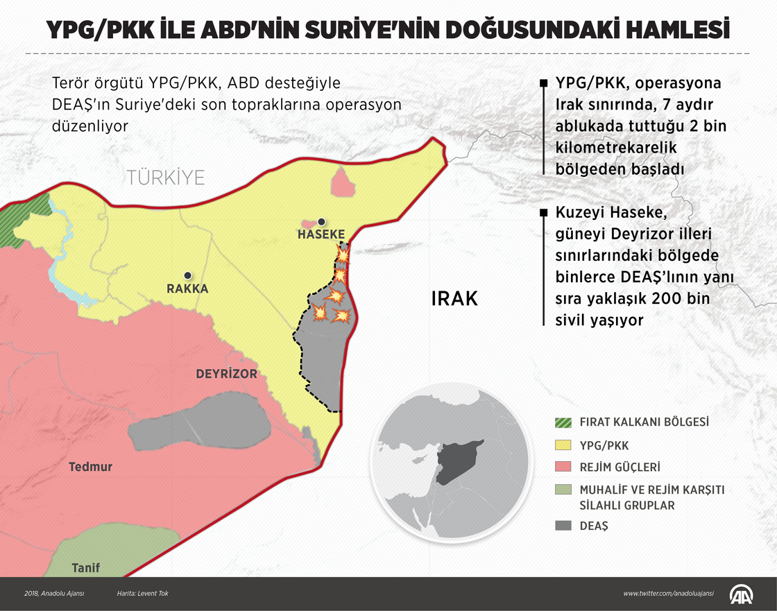 Terör örgütü YPG/PKK, ABD desteğiyle DEAŞ'ın Suriye'deki son topraklarına operasyon düzenliyor. YPG/PKK, operasyona Irak sınırında, 7 aydır ablukada tuttuğu 2 bin kilometrekarelik bölgeden başladı. Kuzeyi Haseke, güneyi Deyrizor illeri sınırlarındaki bölgede binlerce DEAŞ'lının yanı sıra yaklaşık 200 bin sivil yaşıyor. ( Yasin Demirci - Anadolu Ajansı )02 Mayıs 2018•Güncelleme: 02 Mayıs 2018