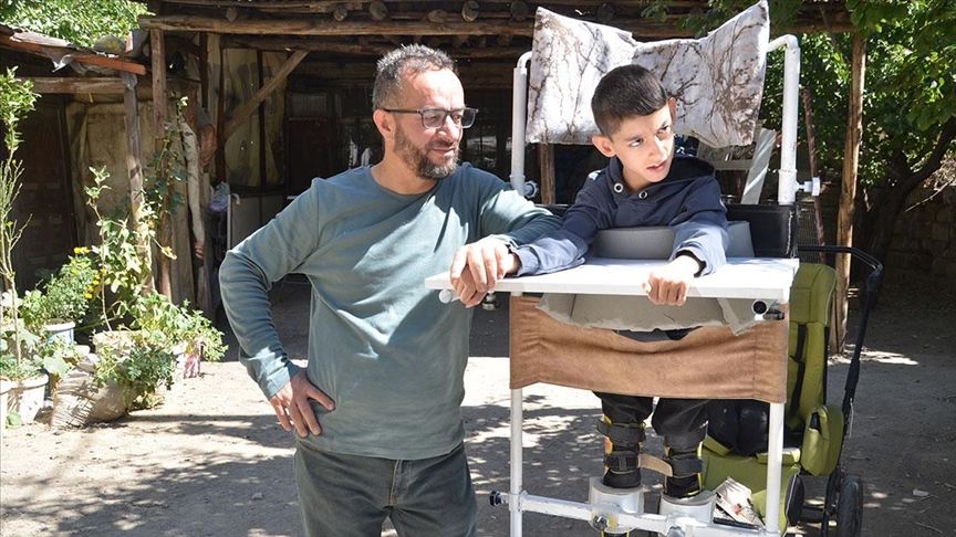 Yeşildere Mahallesi'nde ikamet eden 45 yaşındaki, 5 çocuk babası Budak, 6 aylıkken serebral palsi teşhisi konulan 12 yaşındaki oğlu Ahmet'i gezdirebilmek için "ayakta durma sehpası" yapmaya karar verdi.