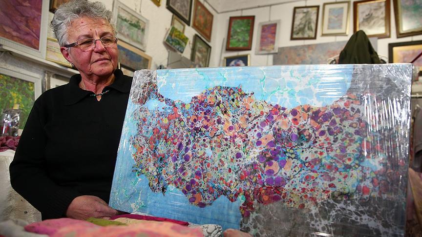 Emekli Öğretmeni 63 yaşındaki Gülten Çuhadar, hobi olarak başladığı ebru sanatında, 3 yılda geliştirdiği kendine has tekniklerle dünya ve ülke haritaları yapmayı başararak bir ilke imza attı.