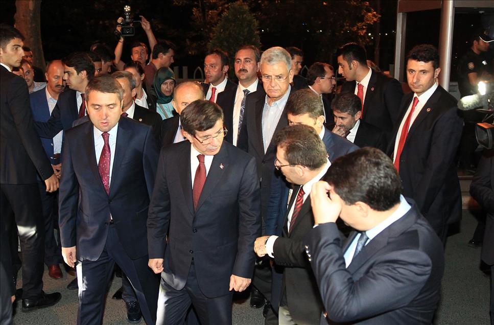 Başbakan Ahmet Davutoğlu (sağda), AK Parti İstanbul İl Başkanlığına silahlı saldırıyla ilgili basın açıklaması yapmak üzere il başkanlığı binasına geldi. (Hakan Göktepe - Anadolu Ajansı)