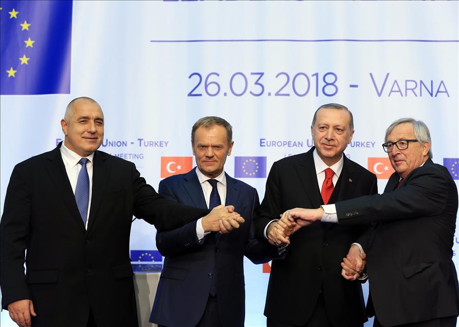 Cumhurbaşkanı Recep Tayyip Erdoğan (sağ2), Bulgaristan Başbakanı Boyko Borisov (solda), AB Konseyi Başkanı Donald Tusk (sol2) ve AB Komisyonu Başkanı Jean-Claude Juncker (sağda) ile Euxinograd Sarayı’ndaki Türkiye-AB Zirvesi’nin ardından ortak basın toplantısı düzenledi. ( Kayhan Özer - Anadolu Ajansı )Kayhan Özer
