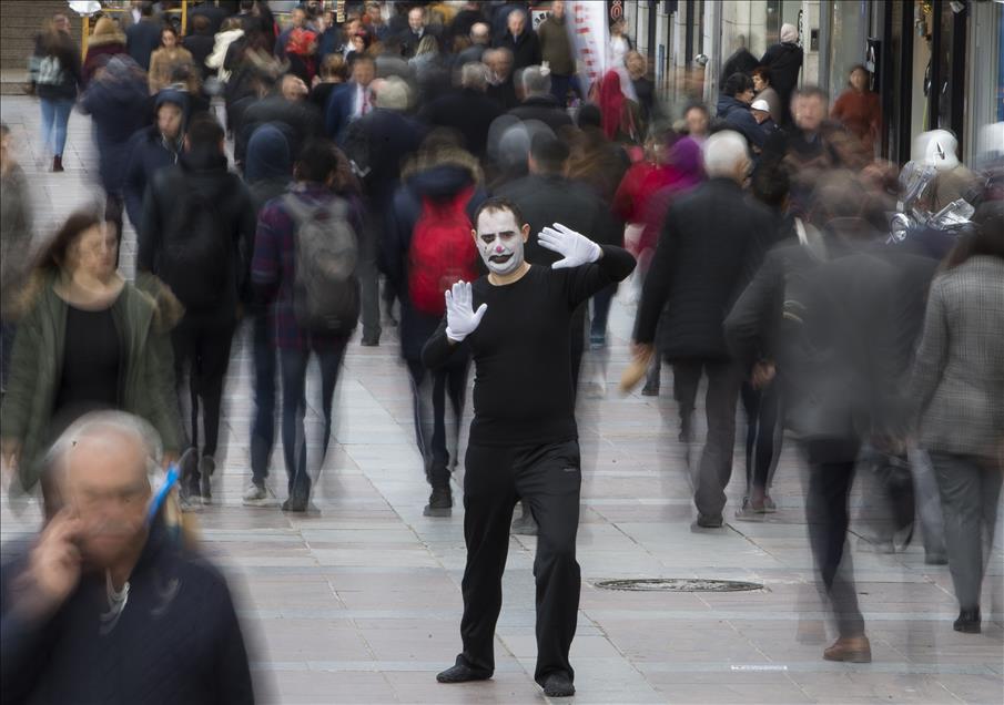 Başkentli Pandomim sanatçısı Evren Ersan, 1995 yılından bu yana tiyatro ile uğraşıyor. 2.5 yıldır Düş Kapanı Sanat Merkezi’nde sanatının inceliklerini öğreten Ersan, zamanla unutulmaya başlayan sokak sanatlarının sıradışı örneklerinin sergilendiği pandomimi Kızılay Meydanında insanların beğenisine sunuyor. ( Murat Kaynak - Anadolu Ajansı )Murat Kaynak