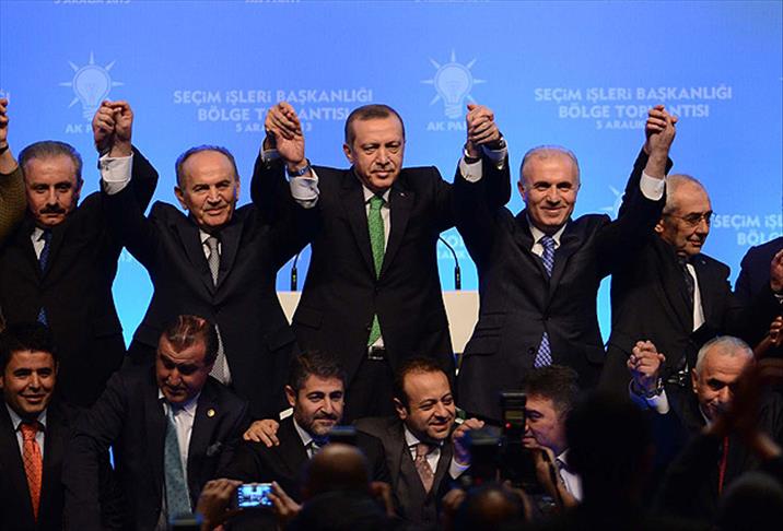 Başbakan Erdoğan, toplantıda yaptığı konuşmada, partisinin lafla değil, eserleri ve projeleriyle seçime girdiğini belirterek, "AK Parti demokrasinin yerelde başladığına inanmış, bunu ilke edinmiş, yerelden yola çıkarak, geneli yani 780 bin kilometrekarenin tamamını hatta yeryüzünü, insanlığı kucaklayan bir anlayış sergileyerek yoluna devam etmiştir" dedi.