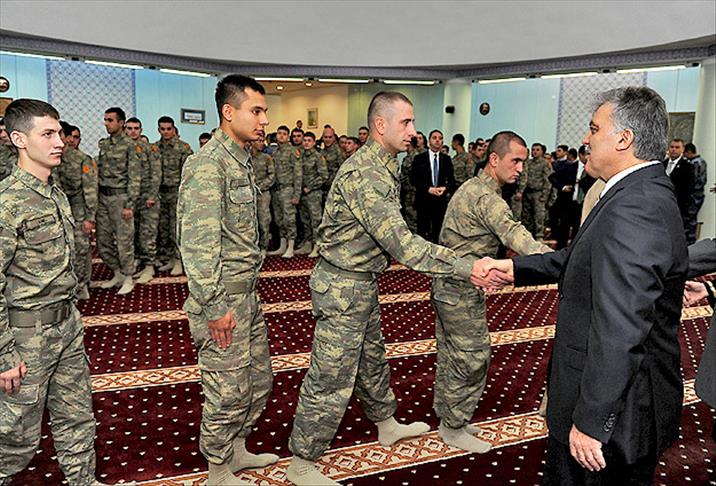 Namazdan sonra askerler ve camide bulunanlarla bayramlaşan Abdullah Gül'e, askerler bayram şekeri ikram etti.