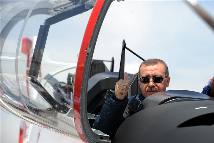 Erdoğan, yaptığı konuşmanın ardından, hangardan çıkarılan ''Türk Başlangıç ve Temel Eğitim Uçağı'' HÜRKUŞ'un başına geldi. Burada pilot montu giyen Erdoğan, uçağa binerek poz verdi. Erdoğan, kokpitte uçakla ilgili olarak, ''gayet güzel, gayet modern'' dedi.