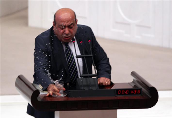 Konuşması sırasında sinerlenen Kaplan, önündeki bardığı kürsüye vurdu.