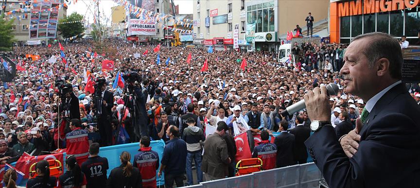 Erdoğan, hükümet olarak milli birlik ve beraberliğin sağlanması için her türlü anlayışı gösterdiklerini belirterek, "Milli birlik dedik, çözüm süreci dedik, birçok kültürel imkanları verdik, red, inkar asimilasyon politikalarını AK Parti iktidarı ayaklar altına aldı. 'Benim Kürt vatandaşlarım, kardeşlerim' diye bağrına basan bir Başbakan, ilk defa Tayyip Erdoğan oldu. Hiç kimse bunu söylemedi. Niye? Çünkü biz yaratılanı yaratandan ötürü sevdik" diye konuştu.