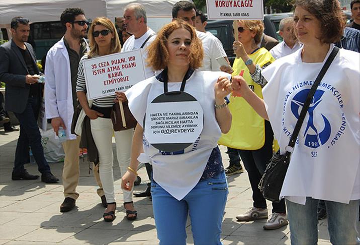 "Grevdeyiz" yazılı yelek giyen gruptakiler, üzerinde "20-21-22 Mayıs günleri ve cumartesi günleri hizmet üretmeyeceğiz", "35 ceza puanı, 100 işten atma puanını kabul etmiyoruz", "Aile hekimliği ceza yönetmeliği geri çekilsin" yazılı dövizleri taşıdı.
