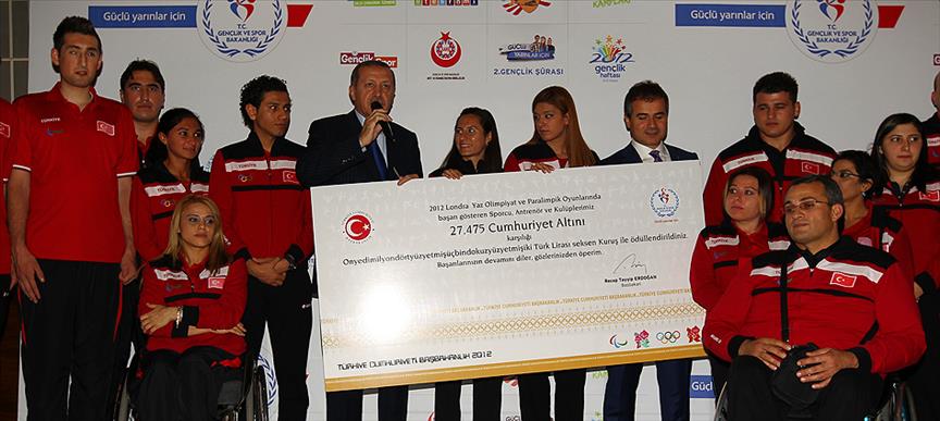 Konuşmasının ardından Londra'da yapılan 2012 Olimpiyatları ve Paralimpik Oyunları'nda madalya alan sporcularla hatıra fotoğrafı çektiren Erdoğan, sporcuların banka hesaplarına toplam 27 bin 475 cumhuriyet altını değerinde 17 milyon 473 bin 973 lira tutarında paranın yatırıldığını bildirdi.