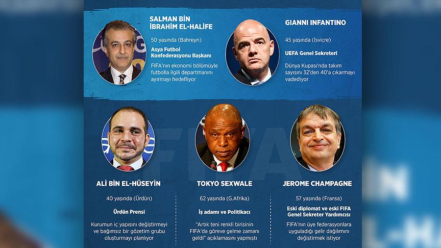 Yolsuzluk soruşturmalarının gölgesinde gerçekleştirilecek FIFA başkanlık seçiminde UEFA Genel Sekreteri Gianni Infantino, Asya Futbol Konfederasyonu (AFC) Başkanı Şeyh Salman bin İbrahim el-Halife, Ürdün Prensi Ali bin el-Hüseyin, eski FIFA Genel Sekreter Yardımcısı Jerome Champagne ve Güney Afrikalı ünlü iş adamı Tokyo Sexwale yarışacak.