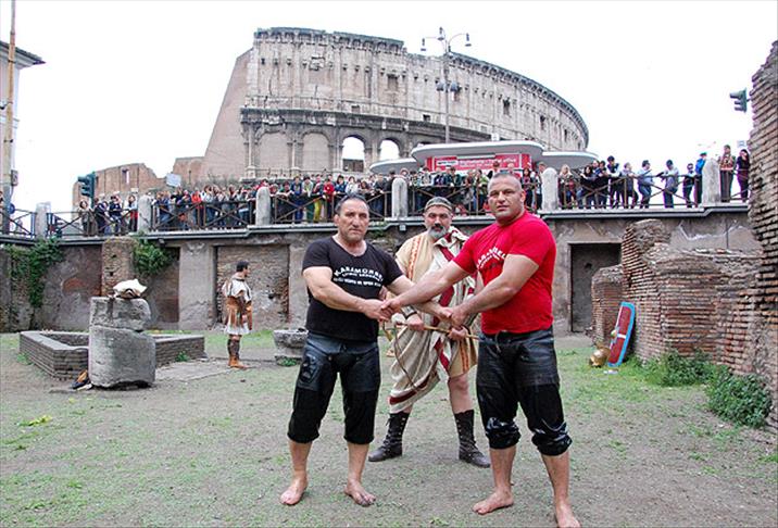 Roma kentinin tarihi ve kültürel güzelliklerinin değerinin bilinmesi ve yüceltilmesi maksadıyla faaliyetlerini yürüten Gruppo Romano Storico'nun bugün düzenleyeceği ''Roma'nın Doğuşu'' isimli bir dizi etkinlik öncesi başpehlivanlar Ahmet Taşçı ve Gökhan Arıcı, ön tanıtım olarak gladyatörlerin mekanında kısa süreli bir gösteride bulundu.