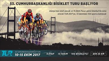 Uluslararası Bisiklet Birliğince (UCI) bu yıl ilk kez World Tour (Dünya Turu) kategorisine yükseltilen TUR 2017, 10-15 Ekim'de Alanya-İstanbul arasındaki 6 etapta koşulacak. Bisikletçiler, Akdeniz ve Ege sahillerinde ilerledikten sonra İzmir'den hava yoluyla İstanbul'a geçecek.
