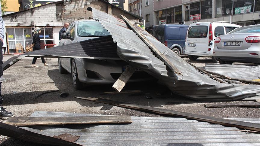 Ağrı'da etkili olan şiddetli fırtına nedeniyle bazı binaların çatıları ile araçlar zarar gördü.