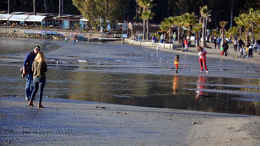 Öte yandan, hava sıcaklığının 19 derece ölçüldüğü Akyaka Mahallesi'nde hafta sonu tatili için sahile gelen çok sayıda vatandaşın, suların çekildiği yerlerde denize doğru yürüyerek fotoğraf çektirdiği görüldü.