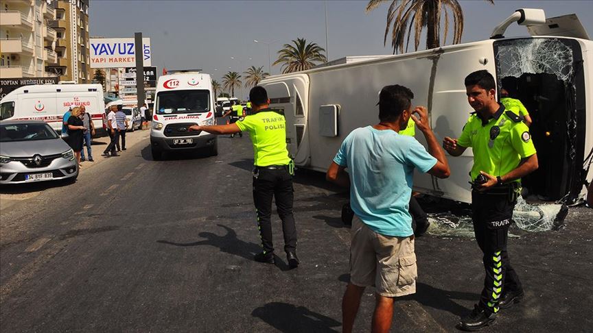 Alanya'dan Antalya Havalimanı'na giden Rus turistleri taşıyan Yavuz Günday idaresindeki 03 ABB 808 plakalı tur midibüsü, D-400 kara yolu Çevreyolu Köprüsü yakınlarında bariyerlere çarparak devrildi.