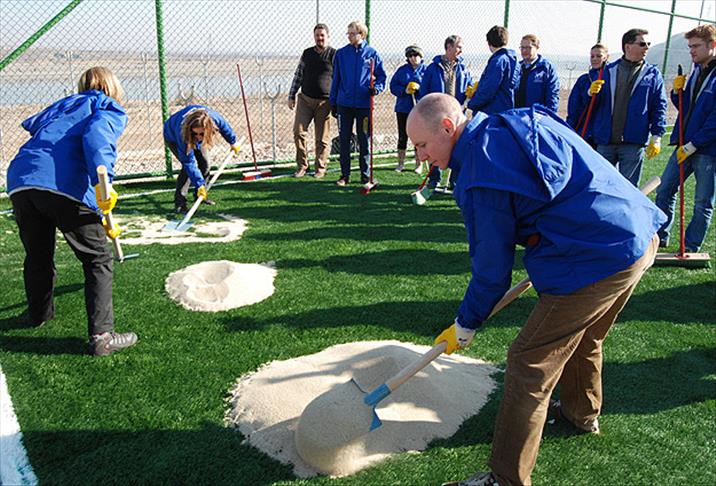 Sırtlarında kum taşıyarak el arabasına boşaltan parlamenterler, aynı zamanda saha içerisinde bulunan çimlere de kum dökerek, direkleri boyadı.