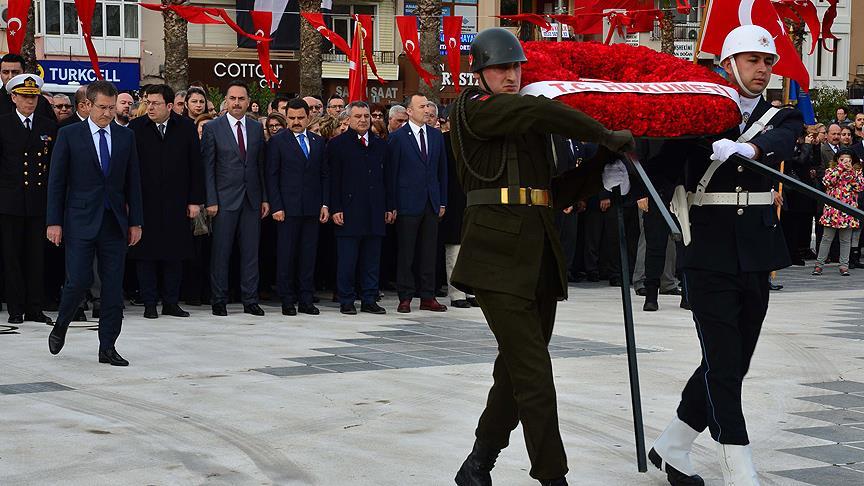 Cumhuriyet Meydanı'ndaki törende, Hükümet adına Milli Savunma Bakanı Nurettin Canikli, Türk Silahlı Kuvvetlerini temsilen Çanakkale Boğaz ve Garnizon Komutanı Tuğamiral Mithat Kemal Algül ile Çanakkale Valisi Orhan Tavlı ve Belediye Başkan Vekili Adnan Güler tarafından Atatürk Anıtı'na çelenk sunuldu.