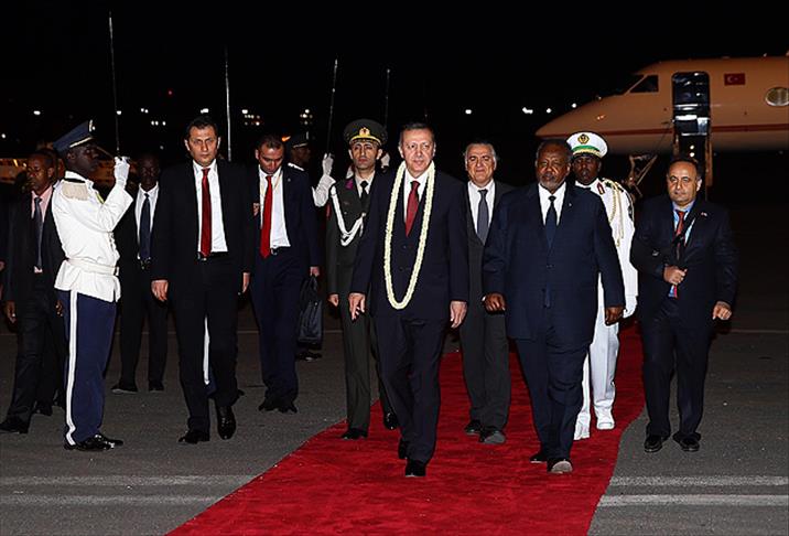 Cumhurbaşkanı Erdoğan'ı, Cibuti Ambouli Havalimanı'nda, Cibuti Cumhurbaşkanı İsmail Ömer Guelleh ve diğer yetkililer karşıladı. Erdoğan ve Guelleh, heyetin konaklayacağı otele birlikte gelerek bir süre görüştü.