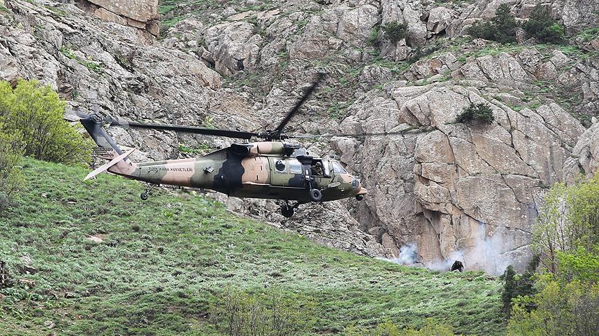 Hakkari Dağ ve Komando Tugay Komutanlığından havalanan helikopter, dağın karşısındaki yüksek kesimlere çıkan askerlerin yön vermesiyle bölgeye indi.