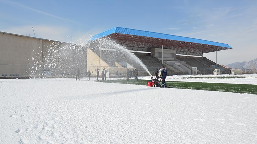 Bu çerçevede Ağrı Dağı eteğindeki Doğubayazıt Şehir Stadyumu'nun zemininde biriken karlar, belediyenin paletli kar temizleme aracıyla temizlendi.