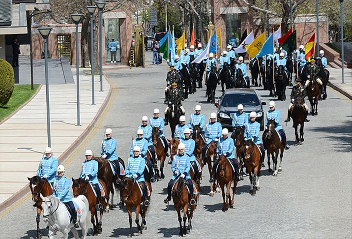 Atlı birliğin eşliğinde tören alanında kendisini bekleyen Sancak ve Onur Kıtası'nı selamlayacak Erdoğan, daha sonra Büyük Şeref Kapısı'nda Türkiye'nin 11. Cumhurbaşkanı Abdullah Gül ve eşi Hayrünnisa Gül tarafından karşılanacak.