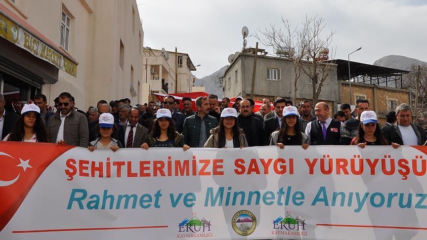 Adı yıllarca terör saldırılarıyla anılan Eruh'ta "18 Mart Şehitleri Anma Günü ve Çanakkale Deniz Zaferi'nin 103. yıl dönümü" dolayısıyla düzenlenen yürüyüşe katılan vatandaşlar, 15 Temmuz Demokrasi Meydanı'nda bir araya geldi.