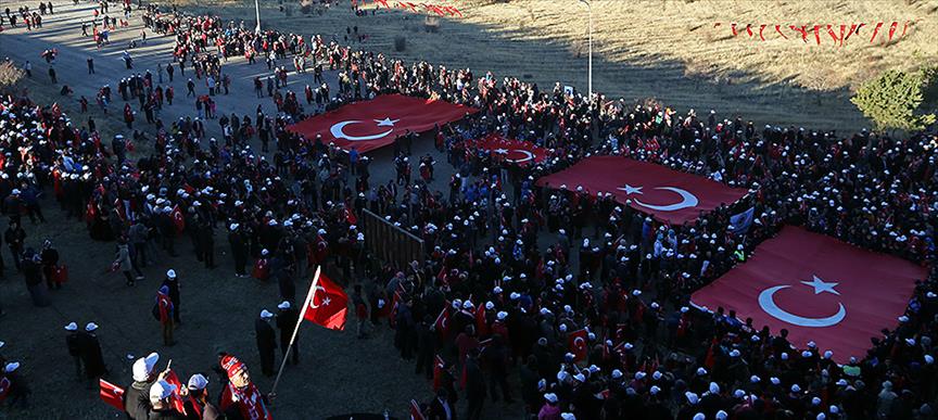 Aralarında çocukların da bulunduğu kalabalık, bayraklarla 4 kilometre uzaklıktaki Top Dağı'nda bulunan Aziziye Tabyası'na yürüyüşe geçti.