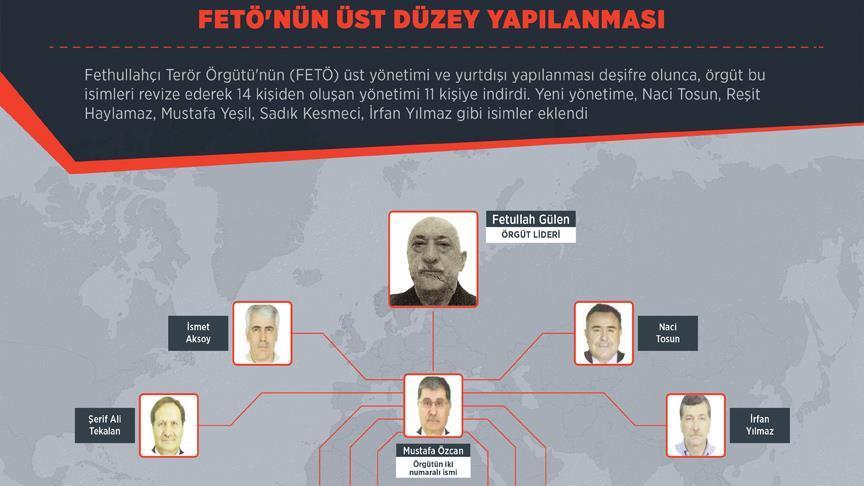 FETÖ üst yönetimi, Fetullah Gülen'den sonra gelen Mustafa Özcan'ın başkanlığında 14 kişiden oluşurken, yeni yönetim 11 kişiye düşürüldü.