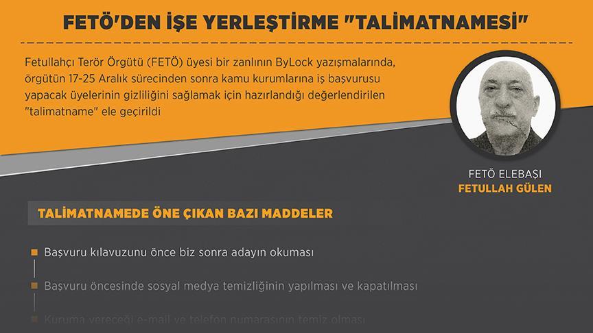 ByLock'ta örgüt üyeleri arasında 6 Ocak 2016'da paylaşıldığı belirlenen ve FETÖ'nün kamu kurumlarında iş başvurusu yapacak üyelerinin açığa çıkmaması için hazırlandığı değerlendirilen 14 maddelik talimatname "lisans ve ön lisans başvurularında dikkat edilmesi gerekenler" başlığını taşıyor.