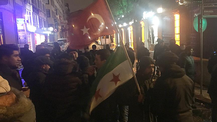 Ellerinde saldırıları kınayan dövizler taşıyan grup, "Müslüman Zulme Boyun Eğmez", "Katil İran Suriye'den Defol", "Katil Esed İşbirlikçi PKK", "Müslüman Uyuma Kardeşine Sahip Çık" şeklinde slogan attıktan sonra olaysız dağıldı.