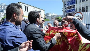 Bu arada bir kişi patlamanın olduğu yere bırakılan bir çelengi eline alarak, "Hem öldürüyorsunuz hem de taziyeye geliyorsunuz" diye tepki gösterdi. Anma programına tepki gösteren kişiyi polisler alandan uzaklaştırdı.