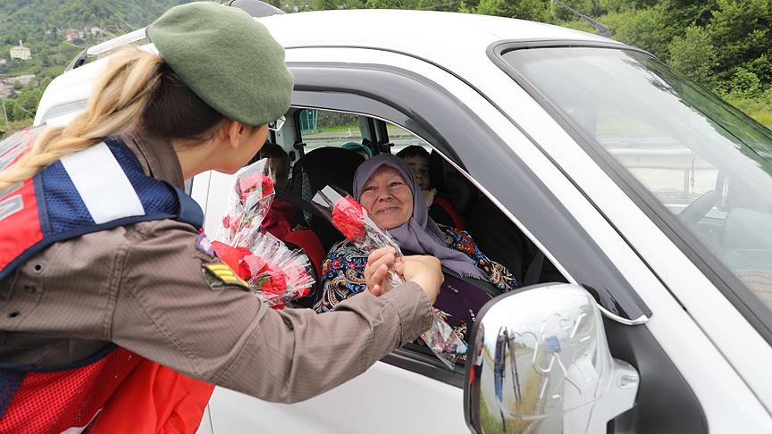 Rize İl Jandarma Komutanlığına bağlı ekipler, sorumluluk alanlarındaki kontrol noktalarında kadınlara gül ve karanfil vererek, Anneler Günü'nü kutladı.