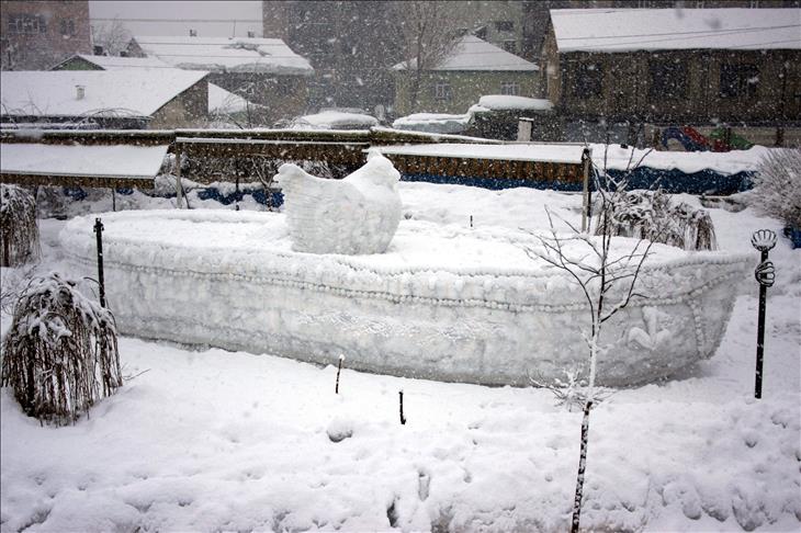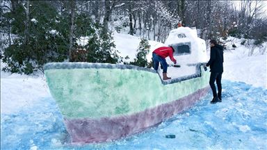 Hakkari'nin Yüksekova ilçesinde bir araya gelen 4 genç, 4 gün süren zorlu bir çalışma sonunda güvertesinde güvercin heykeli olan 10 metre uzunluğunda kardan bir gemi yaptı.
