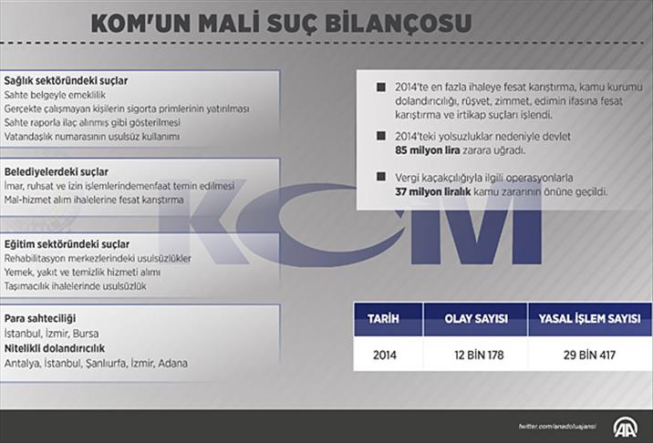 Kaçakçılık ve Organize Suçlarla Mücadele (KOM) birimlerince, geçen yıl mali suçlarla ilgili 12 bin 178 olayda 29 bin 417 kişi hakkında yasal işlem gerçekleştirildi. KOM birimlerinin mali suçlara yönelik operasyonlarında devleti toplam 85 milyon lira zarara uğratanlar hakkında işlem yapıldı, 37 milyon liralık kamu zararı da engellendi. Yerel yönetimler, eğitim ve sağlık alanında en fazla "ihaleye fesat karıştırma", adli hizmetlerde "rüşvet" suçu işlendi.