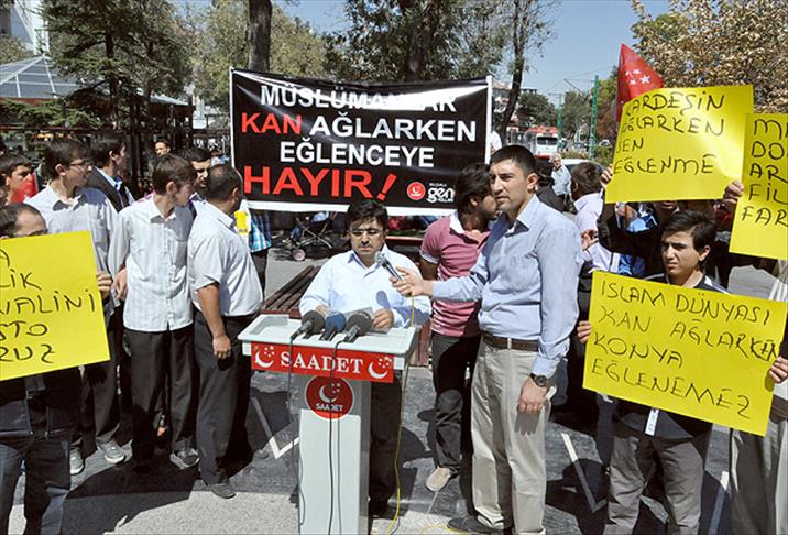 Saadet Partisi Konya Gençlik Kolları üyeleri, 10 Eylül'deki 2. Fanta Gençlik Festivali Konya konserinin iptal edilmesi için basın açıklaması düzenledi. Grup üyeleri, "Müslümanlar kan ağlarken eğlenceye hayır", "Kardeşin ağlarken sen eğlenme" pankartları açtı.