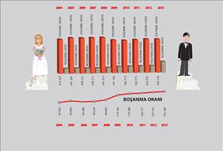 Boşanma oranlarına bakıldığında da 2001 yılındaki krizin ardından 2002'de boşanma oranı yüzde 3,61, 2009'da ise bir önceki yıla göre yüzde 14,5 oranında artarak, boşanmanın son 11 yıl içinde en çok arttığı yıl oldu.