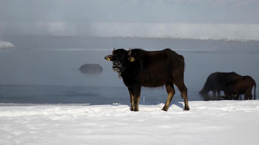 Türkiye'nin en soğuk yerleşim yerlerinden Van'ın Çaldıran ilçesinde mandalar, Kaz Gölü Çayı'nın zeminindeki taze otlarla besleniyor.