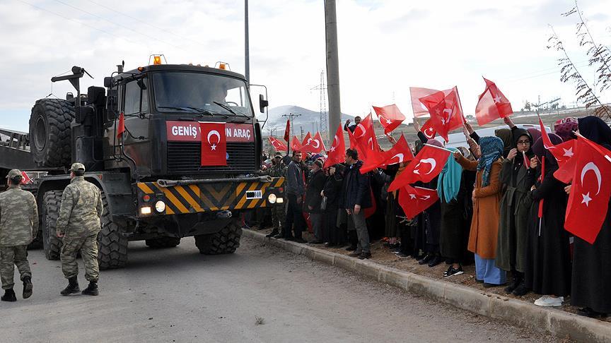 Türk Silahlı Kuvvetleri (TSK) tarafından Suriye'nin kuzeybatısındaki Afrin bölgesinde terör örgütleri PYD/PKK ve DEAŞ'a yönelik yürütülen "Zeytin Dalı Harekatı"na katılacak askerler ve zırhlı araçlar, tekbir ve dualarla uğurlandı.