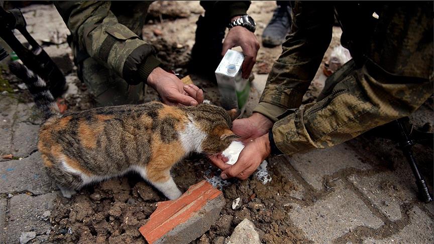 Twitter hesabından yapılan ve askerlerin avuçlarında bir kediye süt verdiği fotoğraf, sosyal medya kullanıcıları tarafından kısa sürede yüzlerce kez paylaşıldı.